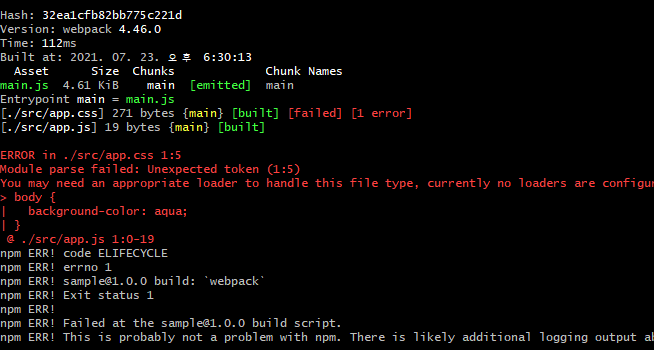 먼저 app.css 파일을 하나 만든 뒤에 body에 백그라운드만 아쿠아로 설정 해준 뒤에 app.js 파일로 가서 임포트를 해준 뒤에 웹팩을 돌려보면 아래와 같은 에러가 뜬다. 웹팩은 알다시피 모든 파일을 모듈로서 해석하는데 css파일코드를 자바스크립트 코드로 파싱하는데 에러가 생겼다고 한다.