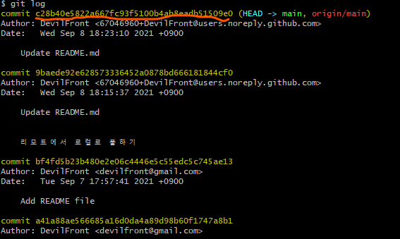 이런 식으로 커밋 내역들이 나오고 주황색으로 밑줄 친 내용이 커밋 해시, 혹은 커밋 아이디이다.