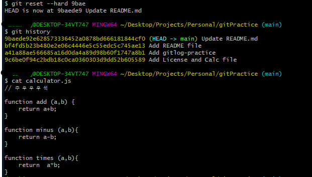 이전 단계의 커밋인 9bae~~~로 한 번 리셋하고 내용이 바뀌었는지 확인 해보겠다.