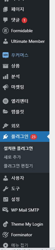 우선 관리자 페이지 왼쪽 메뉴바들을 보면 플러그인 창이 있는데 누르고 들어 간 뒤에