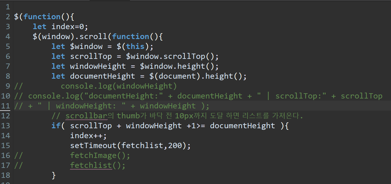 1 > 어머 스크롤이 바닥에 거의 닿거나 내가 원하는곳에 갔네~?