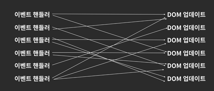 사실 리액트를 사용하지 않아도 얼마든지 웹 페이지를 html, css를 이용해 만들 수 있다. 그러나 html과 css등으로만 만들어진 웹페이지는 동적인 데이터를 UI에 뿌려주기에는 적합하지 않다.리액트를 이용한다면 사용자와 상호작용할 수 있는 UI를 손쉽게 만들어 줄 수 있다. 어느정도 규모있는 프로젝트를 진행하다보면 위의 사진과 같이 복잡한 관계를 가지게 된다.