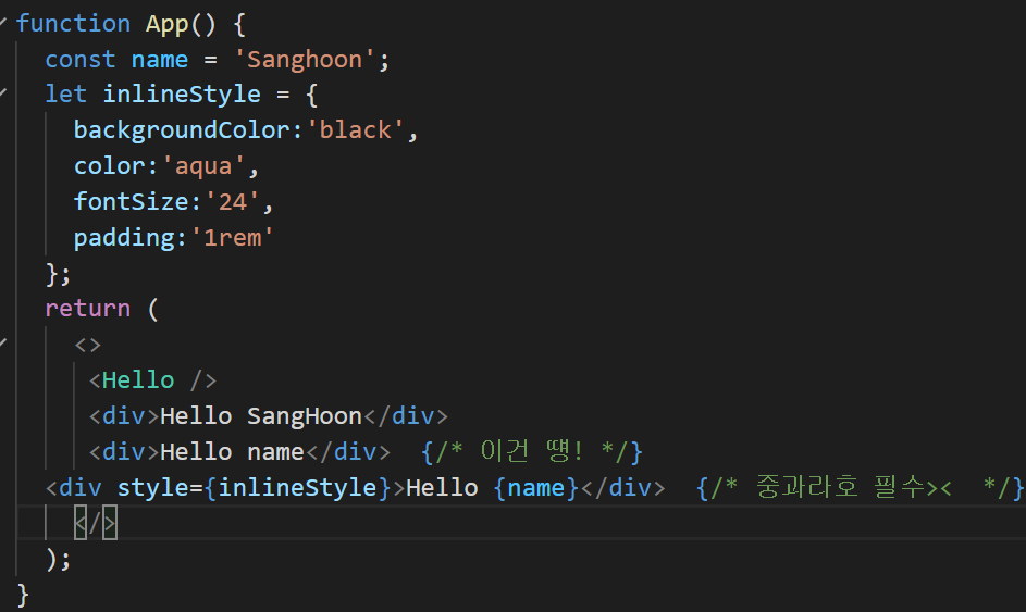 <div style="background:black;"></div>이런식으로 간단한 스타일링등은 직접 태그에다 먹여줬는데 이런 식으로 코드를 작성해주면 에러가 난다. 인라인스타일을 먹일려면 따로 객체를 만들어 줘서 넣어주면된다.