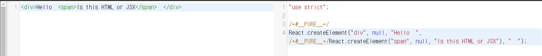 위의 사진을 보면 그저 Hello 와 span 태그로 문구하나를 써준것이 오른쪽의 스크립트코드로 변환 된 것을 볼 수 있을 것이다.