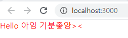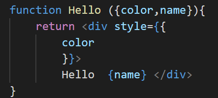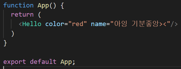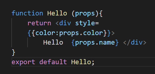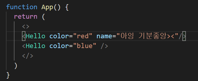 위의 코드와 같이 헬로라는 컴포넌트를 불러와서 써줄 때 헬로컴포넌트의 'name'값을 원하는 것으로 설정, 'color'를 빨강색으로 설정을 해주려면 헬로컴포넌트에서 처리를 해주면 된다. 한번 Hello컴포넌트에서 name값과 색깔을 이용해보자.