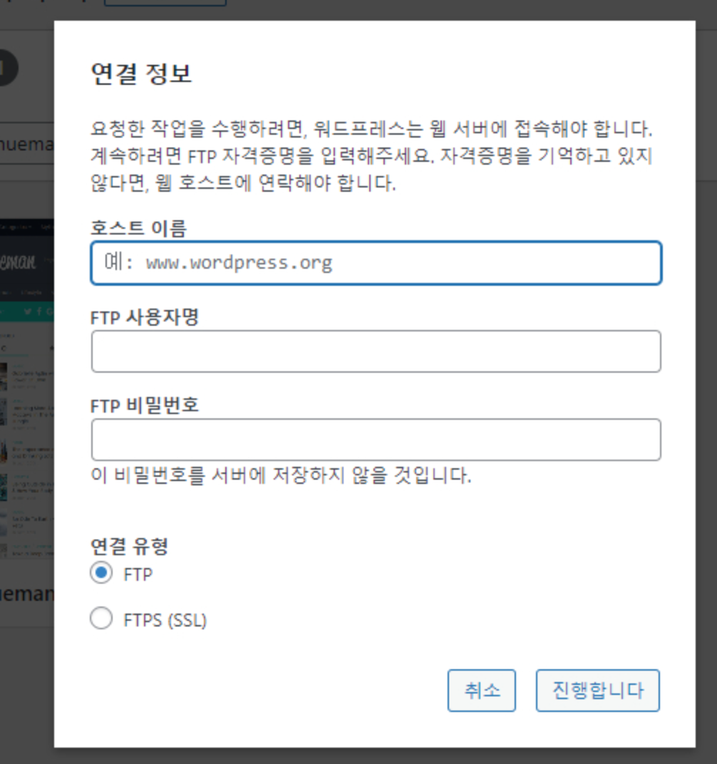 워드프레스 서버 설정을 마치고 테마 혹은 플러그인을 설치하려고 하면