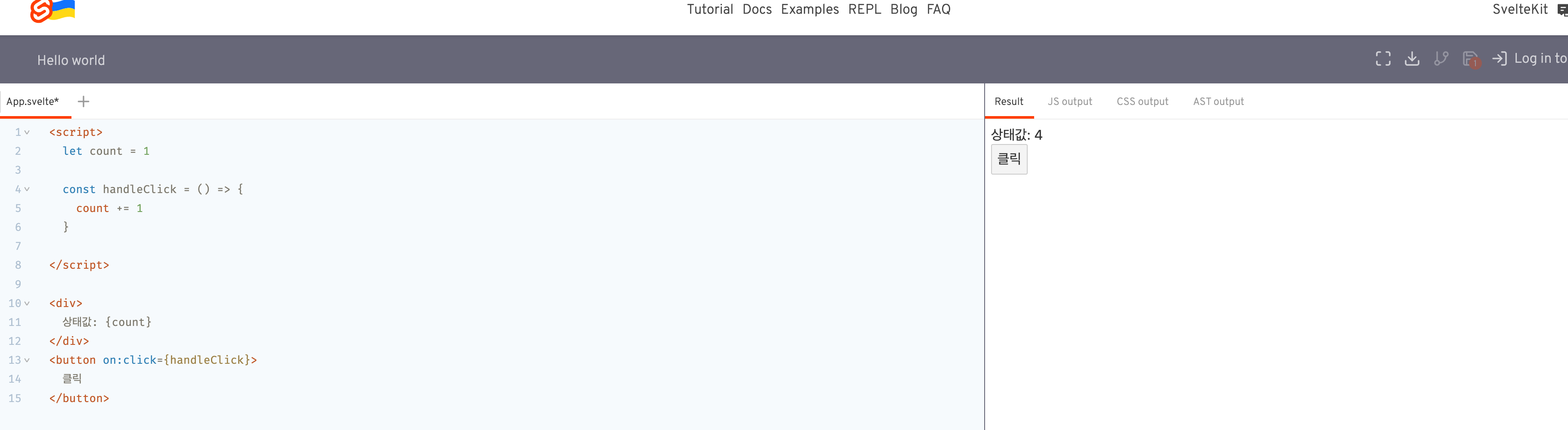 <button on:click={handleClick}> // 이 문법은 처음 보긴했는데 저런식으로 쓰는가 보다 하면 되겠다.
