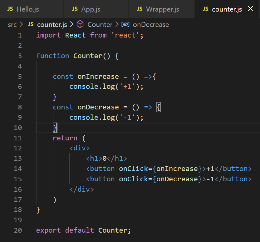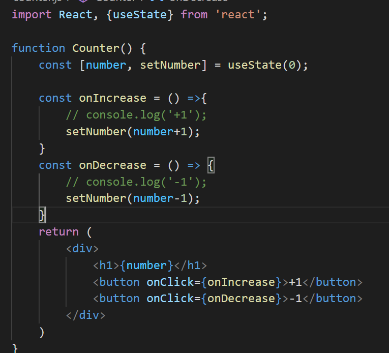 이런식으로 Counter 컴포넌트를 만들어준 뒤에 버튼을 눌러서 콘솔창을 확인해주면 +1 과 =1 이 잘 찍히는 것을 볼 수 있을 것이다. 아직은 저 0 이라는 값을 조절해주지 못하는데 'useState'를 이용해서 한번 조작해보겠당!