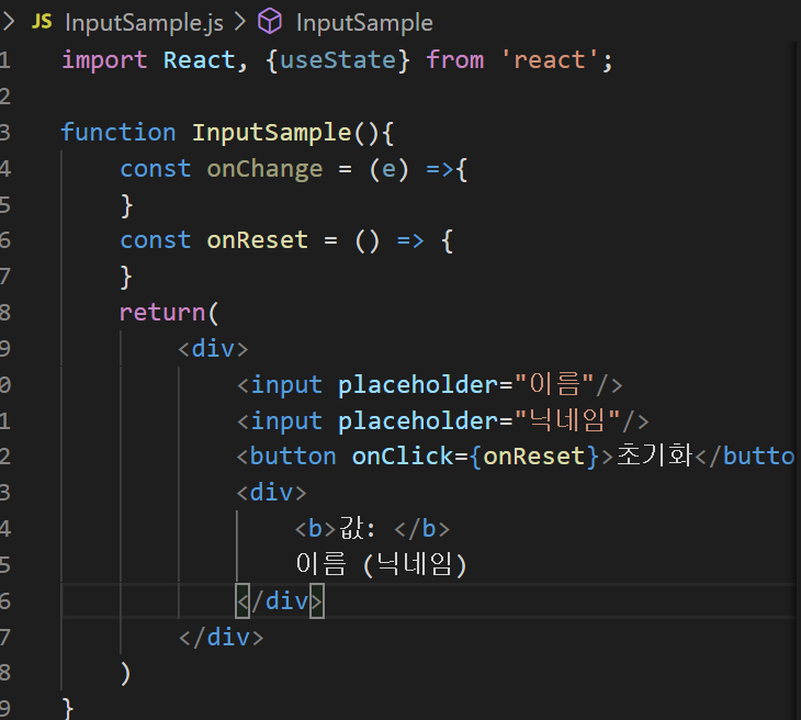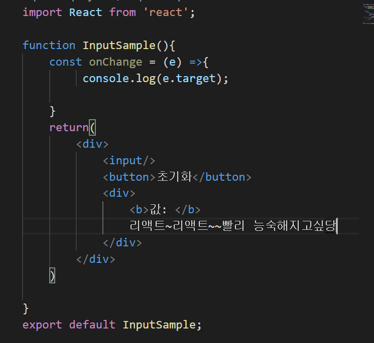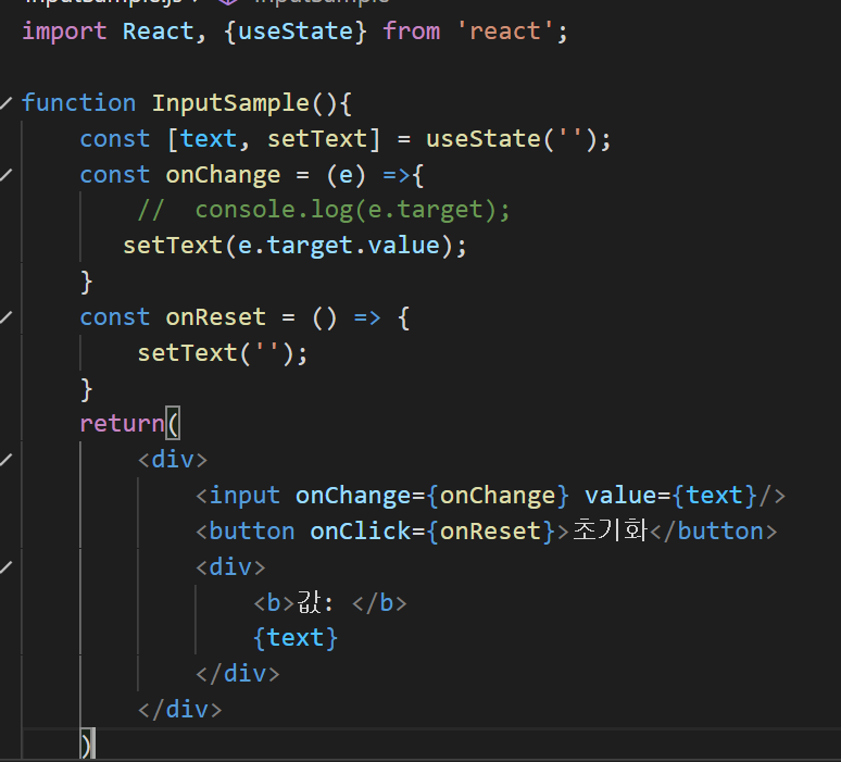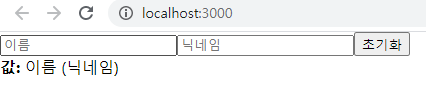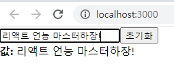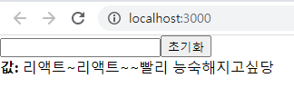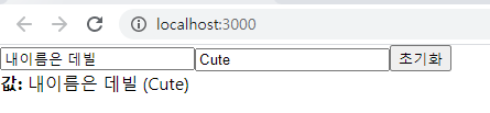 이런식으로 상태값이 바뀌고 초기화 버튼을 누르게 되면 다시 빈칸으로 설정 되는 것을 볼 수 있다. 저번 숫자값을 동적으로 변화시키는 글과 달라진 점은 우선 event 를 인자로 받아서 target.value 를 써준 것인데 현재 <input>태그에 입력되어 있는 텍스트로 값을 변화시켜야 되기 때문에 e.target.value 로 값을 세팅해준 것이다.