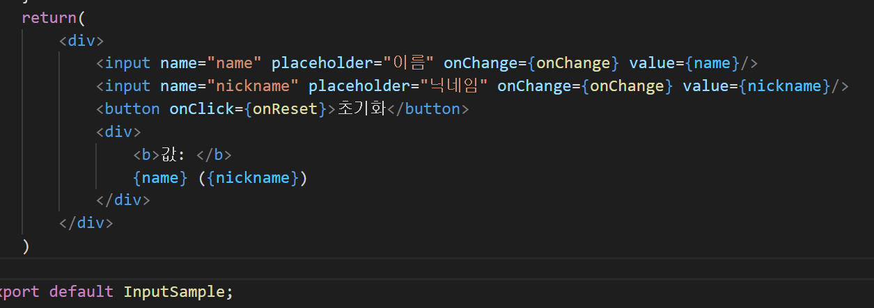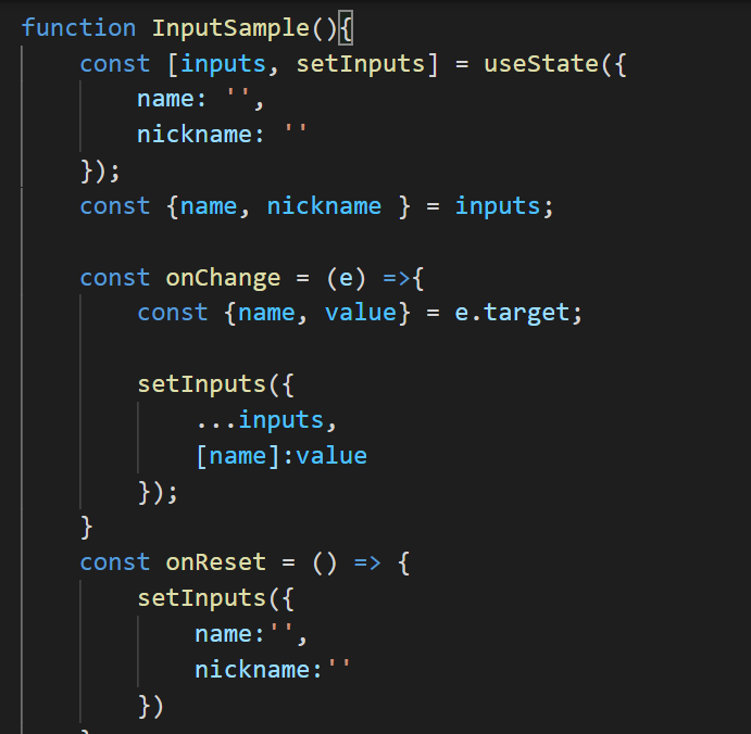 기존 한개의 인풋상태관리에서 달라진 점은 바로 여러개의 문자열 (name,nickname) 을 가지고 있는 객체상태를 업데이트 해준다는 것이다!! 중요한 점이 기존의 상태 , 즉 업데이트하기 전 상태를 복사하고(...inputs spread문법 )