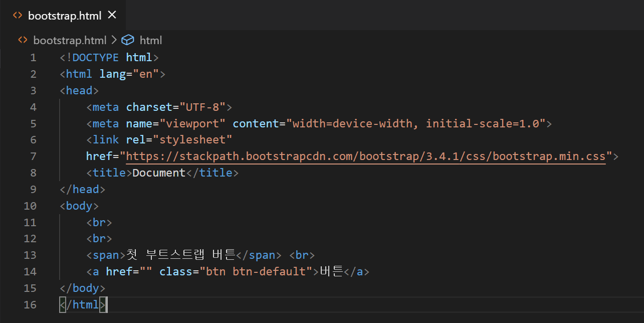 이 한마디로 표현 할 수 있겠다 간단히 사용방벙과 부트스트랩을 이용해서 버튼하나를 나타내 보겠다.