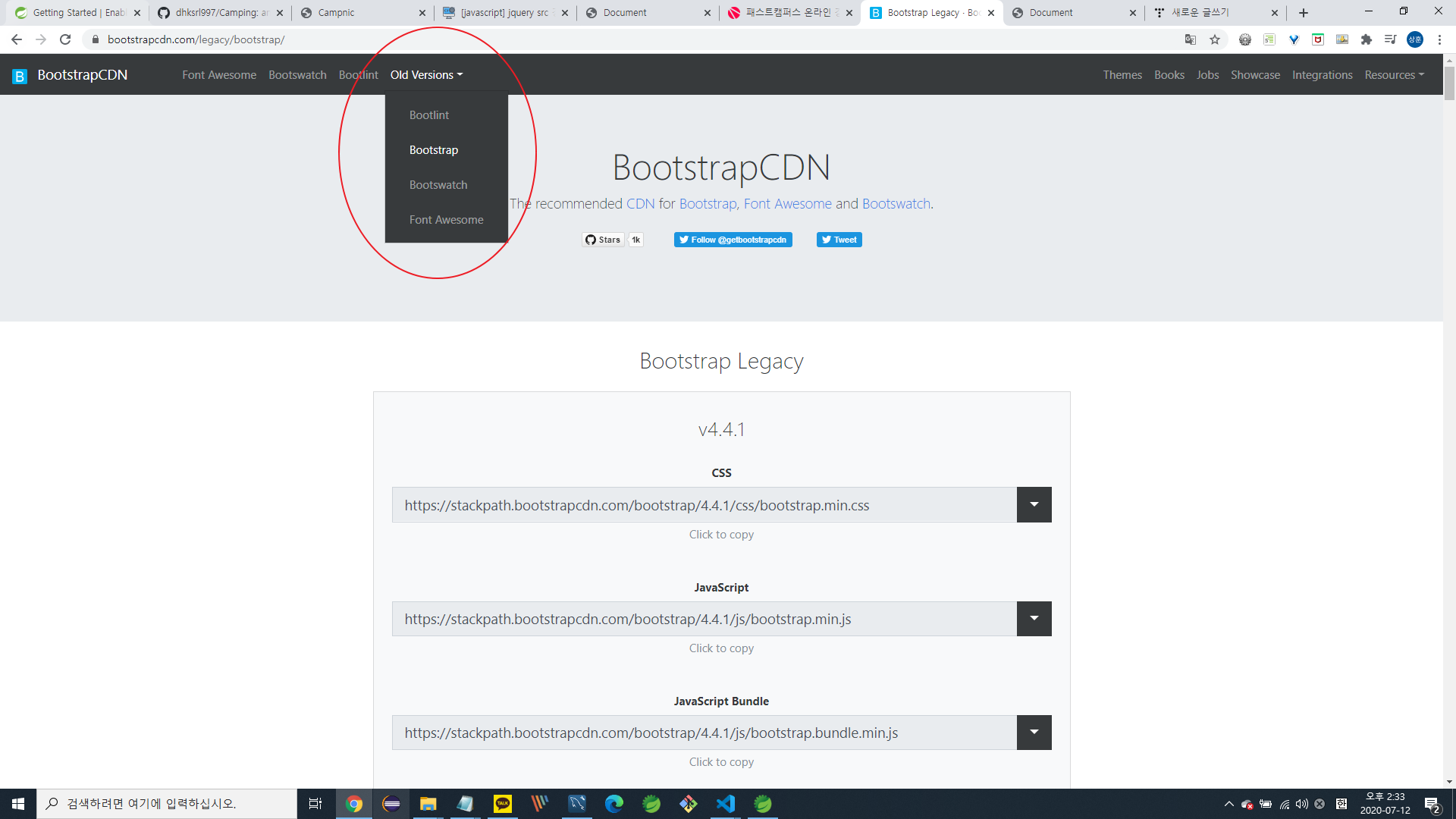 검색창에 bootstrap cdn 이라고 입력한 뒤에