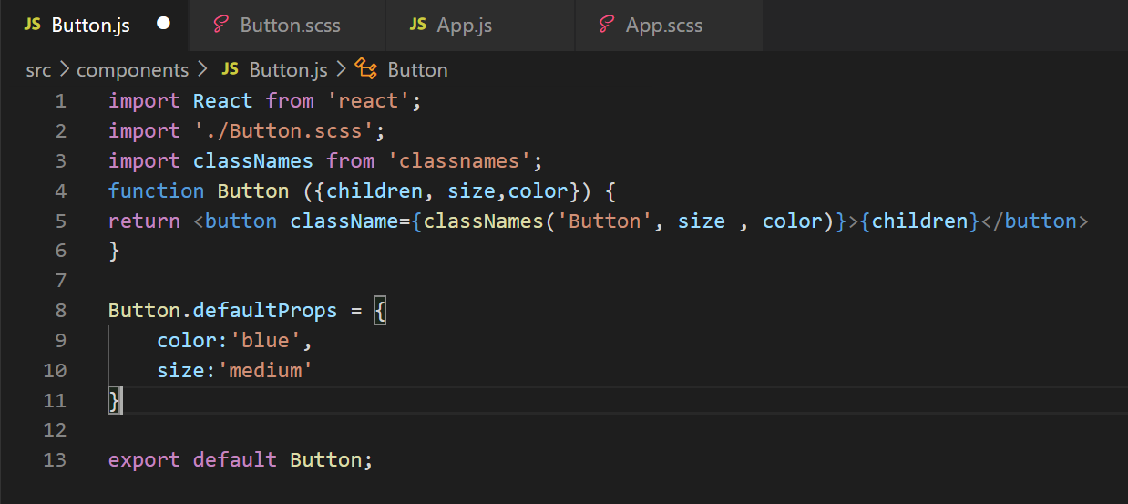 설치가 되면 props 로 size 와 color 를 받아준다. 받아와준 props들이 그대로 <button> 태그의 클래스명으로 들어가게 되고 color와 size 의 기본값을 설정해준다. (defaultProps)