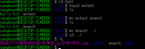위 사진을 보면 mvtest 라는 이름의 파일을 만들고 이름을 바꿔본다음 디렉토리까지 한 층 위로 올려준 모습이다.