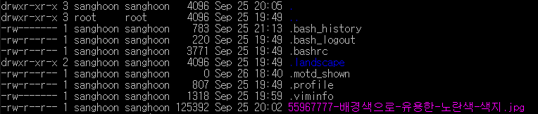 또한 뒤에 이어지는 rwx 단위로 끊어지는 문구는 read, write, execute 의 줄임말로 읽고 쓰고 실행할 수 있는 권한을 뜻한다. ㅡ 로 표시되는 것은 권한이 없다는 것이고 rwx가 3번씩 반복되는 데 앞에서부터 사용자/그룹/기타 순으로 대상이 누군지 알 수 있다.