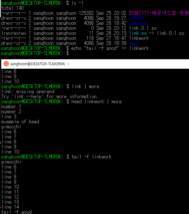 이런 식으로 tail -f 로 파일의 마지막 부분을 켜두고 다른 커널에서 뒤에 문구를 추가해주면 실시간으로 파일에 추가되는 사항이나 메세지를 확인 할 수가 있다.