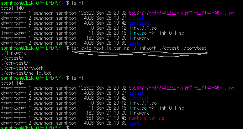 tar 명령어뒤에 cvfz 를 입력해준뒤에 압축할 파일명을 적어주고 그 뒤에는 / 로 구분해주면서 디렉토리명이나 파일명들을 적어주면 되겠다. 만약 현재 위치한 파일이나 디렉토리 모두 압축할때는 * 를 써주면 되겠다.