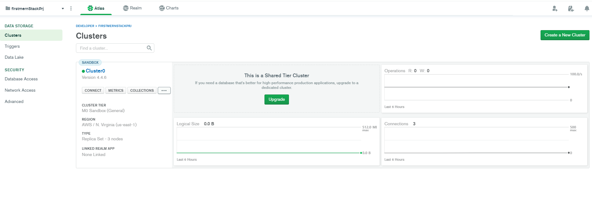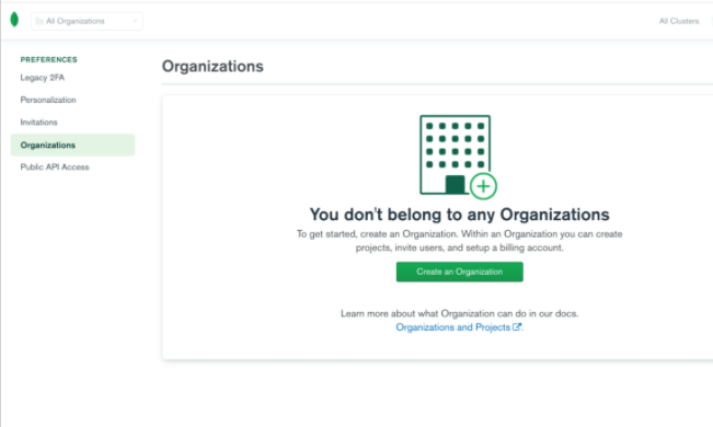 여기에서 가운데 create organization 를 누른뒤에 create project 버튼을 누른다. 프로젝트 까지 안내에 따라 만들게 되면 드디어 Cluster를 만들 수 있게 된다.