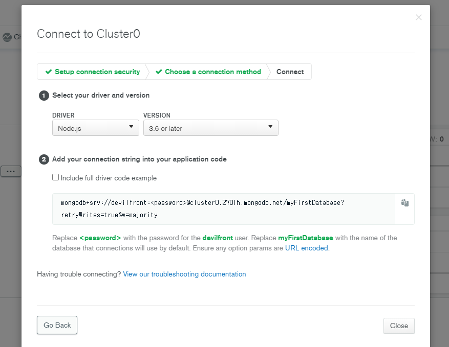 const CONNECTION_URL = 'mongodb+srv://devilfront:{각자 설정한 비밀먼홍~}@cluster0.270lh.mongodb.net/myFirstDatabase?retryWrites=true&w=majority';