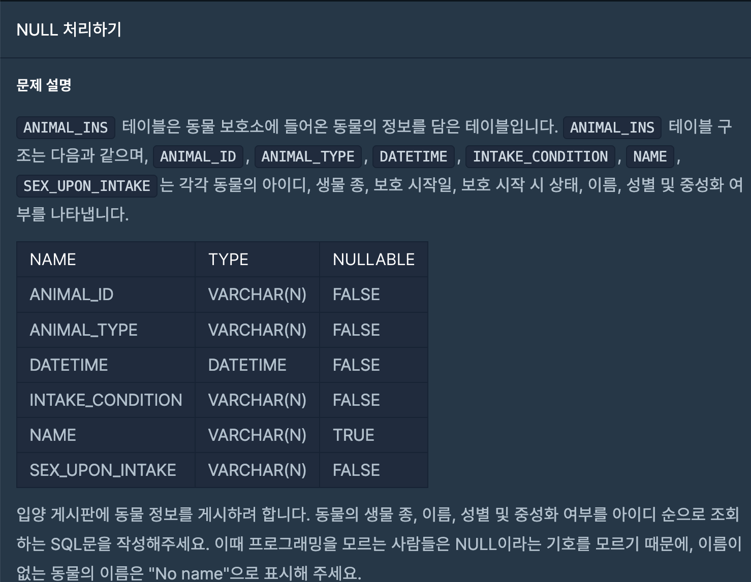 회사에서 여유 시간이 남아 서버쪽 코드와 sql 쿼리 날리고 있는 부분을 봤는데 3년전 개발학원에서 잠시 봤던 SQL 지식으로는 뭐가 뭔지 모르겠어서 프로그래머스에 있는 SQL 문제들을 풀면서 감을 익히려고 보다가 내 기준 신선하거나 처음 보는 문법, 방법 등을 만날 때 마다 정리하려고 작성한다. --> 헷갈리거나 기억 안 나면 바로 내 글 보러 오기위해 ㅋㅋ