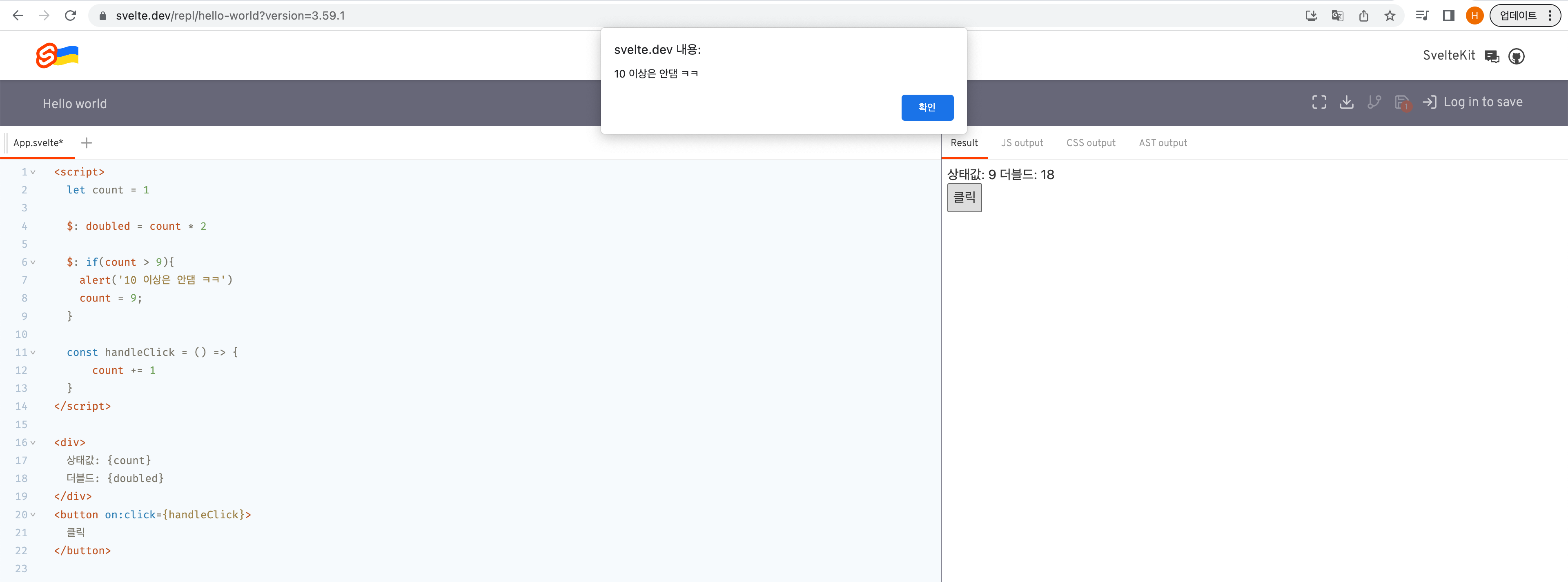 코드를 보면 doubled에는 직접적으로 변화를 주진 않지만 반응성으로 선언 해준 뒤 카운트 값만 바꿔 줬는데 실제로 해보면 잘 바뀌는 것을 볼 수가 있을 것이다.