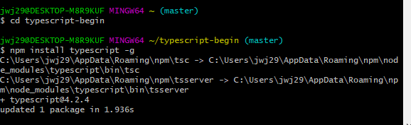 1. VsCode 내의 터미널을 이용하든 깃배쉬를 이용해서 npm 패키니 매니저를 통해서 타입스크립트를 전역으로 설치해준다. (어느 파일에서든 컴파일 가능)